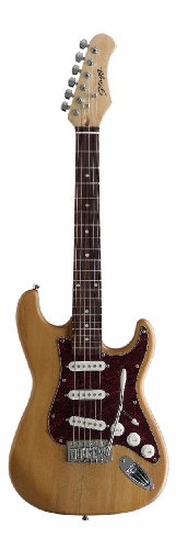 The Stagg S300 uses solid alder for the body, with a bolt-on maple neck and rosewood fingerboard. It uses Strat-style electronics, with three single-coil pickups and a selector switch to toggle between them. The hardware will also be familiar to Fender players, with an S-style tremolo bridge and open-gear tuners.